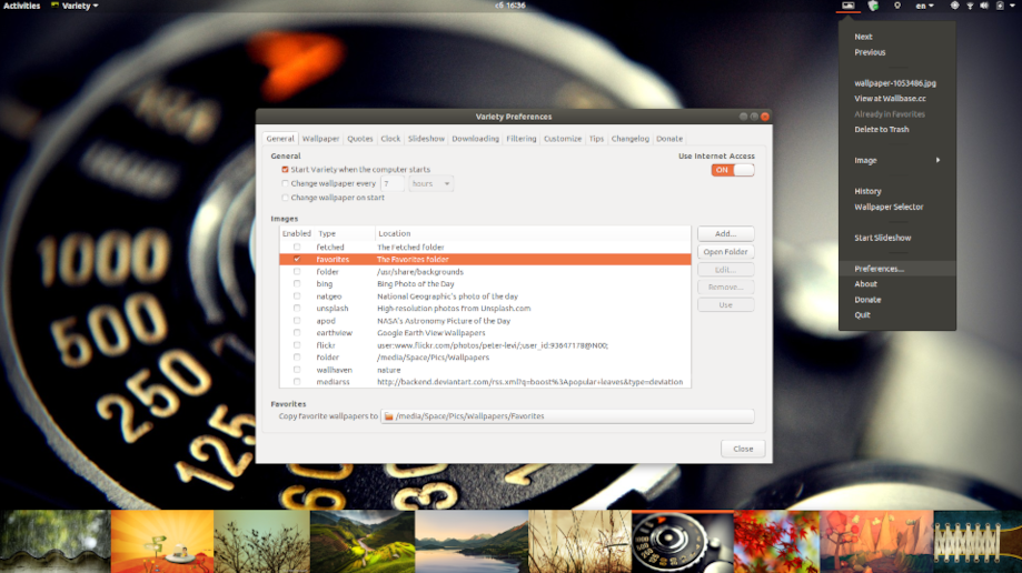 It's a good wallpaper changer. I only use my own images, saved to the Favorites file under .config/variety, and while it uses all my images, it doesn't use them in order. I'll see image 1, then image 2, then image 1 again, and I don't see image 7 for an hour. This would be five stars if the rotation of my images was consistent, and if changing the fonts on the built-in clock Desklet actually worked.