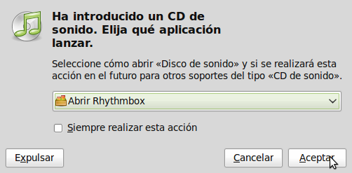 Ahora al insertar el disco me mostró la siguiente pantalla de donde escogí la opción "Abrir Rhythmbox".